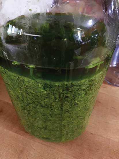 To make a tincture, use 1 ounce fresh herb by weight for every 2 ounces high-proof alcohol by volume. Blend or chop your herb and pack into a jar, then cover to the top with alcohol.